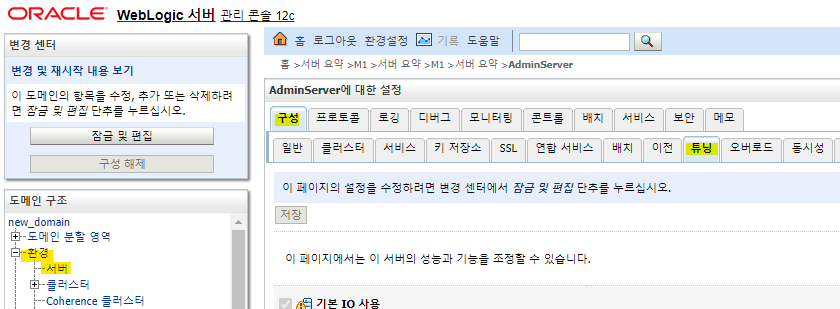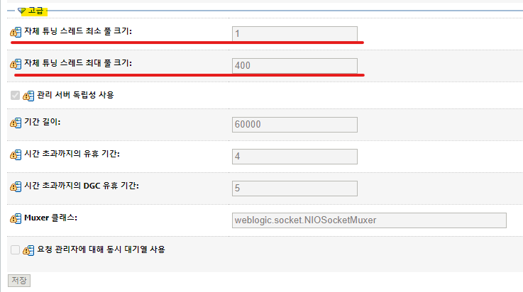 콘솔 - 환경 - 서버 - 서버 선택 - 구성 - 튜닝 - 고급 - 자체 튜닝 스레드 최소/최대 풀 크기 설정