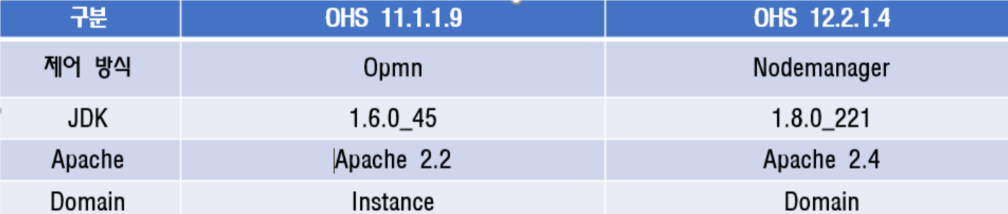OPMN(Oracle Process Manager and Notification Server) 이 사라지고, 대신 Nodemanager와 WebLogic Management Framework인 WLST가 도입되었으며, 이로 인해 Component들의 managing 방법이 달라짐