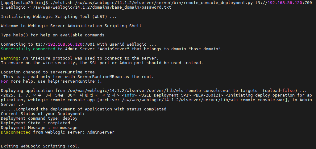 ./wlst.sh ${WL_HOME}/server/bin/remote_console_deployment.py t3://${ip}:${port} ${username} < password.txt
