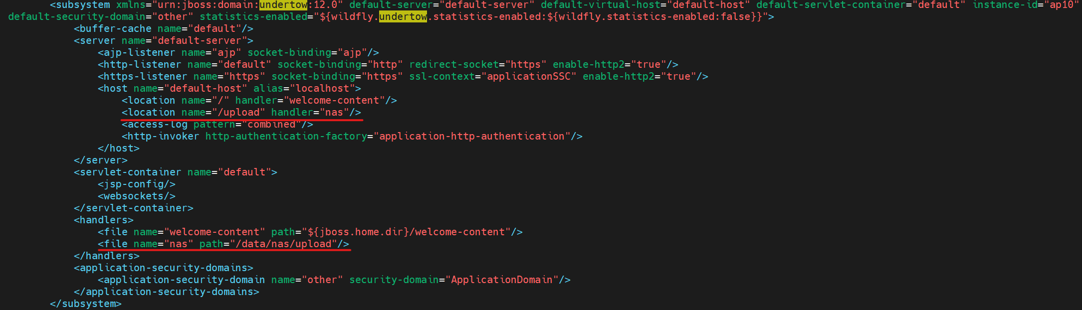ex) /subsystem=undertow/configuration=handler/file=nas:add(path=/data/nas/upload)