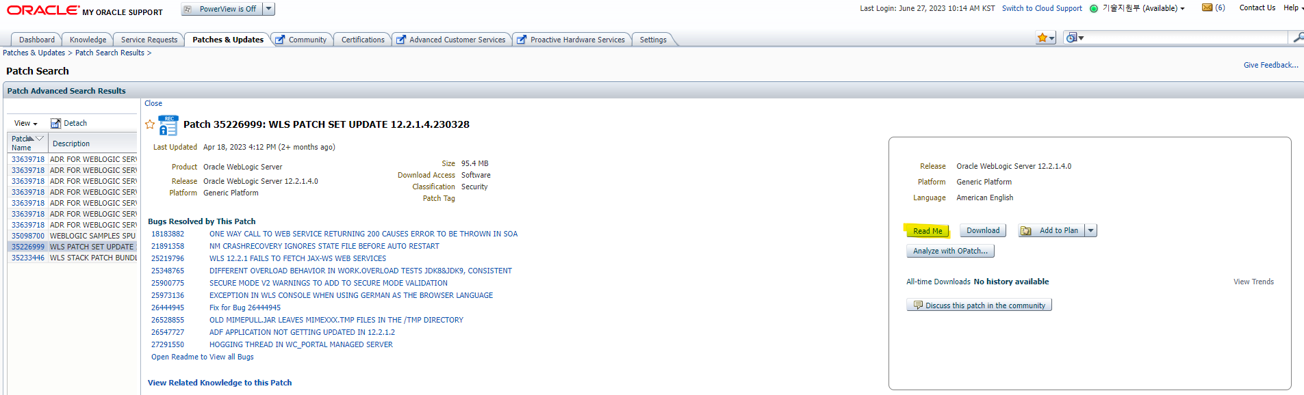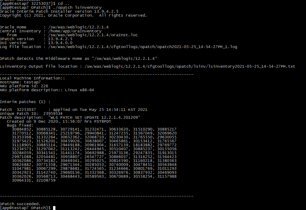 ※ 패치는 숫자가 커질수록 최신이고, 적용 weblogic 버전을 확인할 수 있음