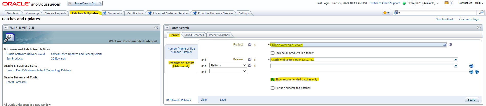 - 제품과 릴리즈를 입력하고 권장 패치만 표시 체크 후 검색