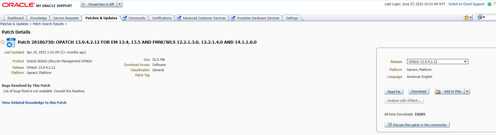 ※ opatch 업그레이드 파일은 28로 시작하고 opatch 버전을 확인할 수 있음