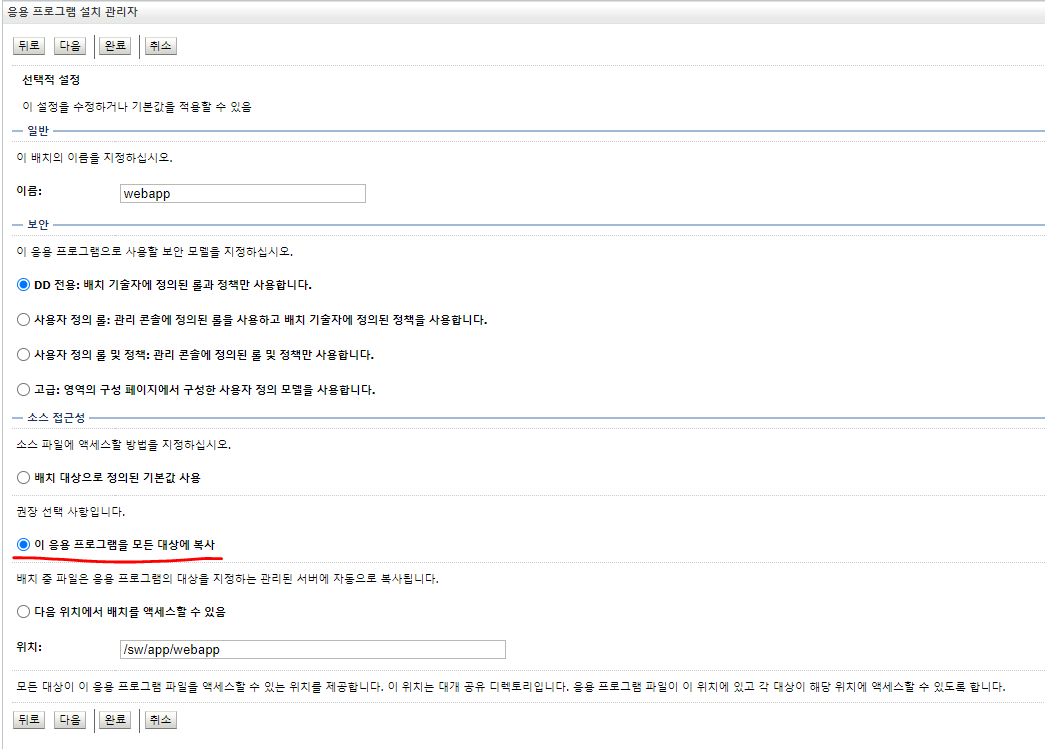 ex) 하나의 클러스터에 3개의 managed 서버가 포함되어 있다면, 3개의 managed 서버에 복사하여 배포함.