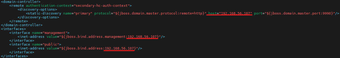 ${WILDFLY_HOME}/domain/configuration/host-slave.xml 파일 중 아래 내용을 확인해볼 것!