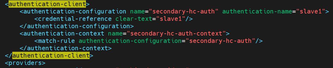/host=slave1/subsystem=elytron/authentication-configuration=secondary-hc-auth:add(authentication-name=slave1, credential-reference={clear-text=slave1})