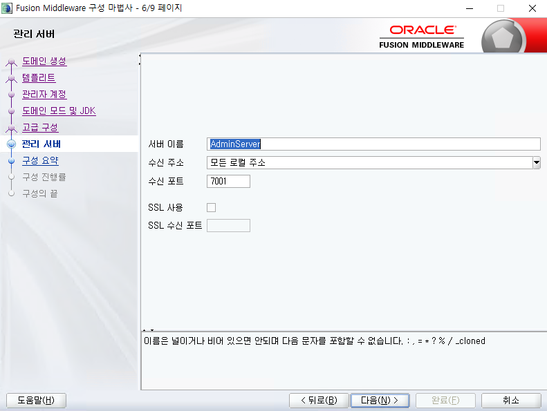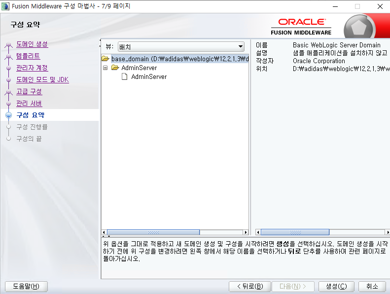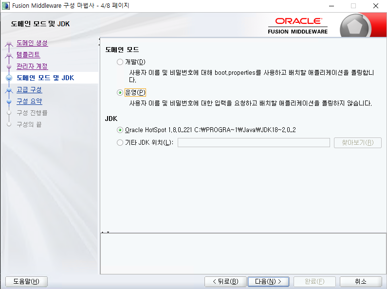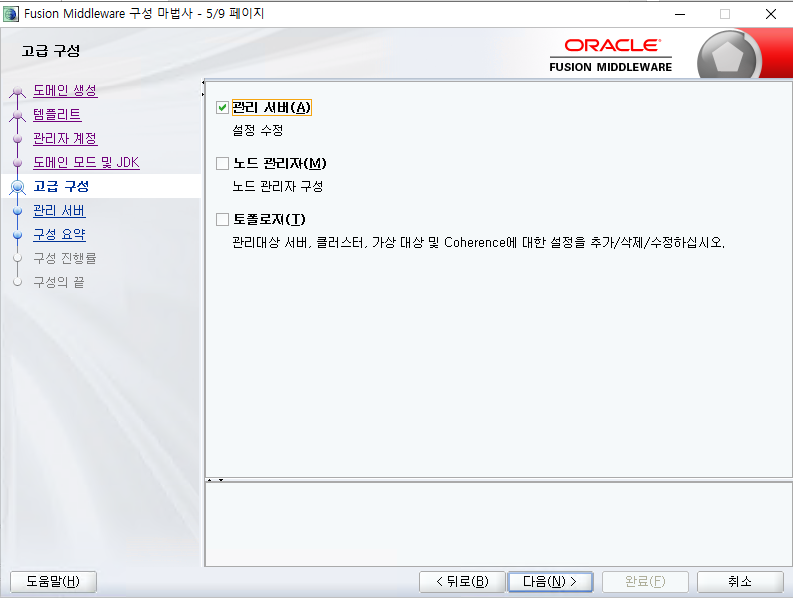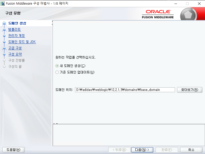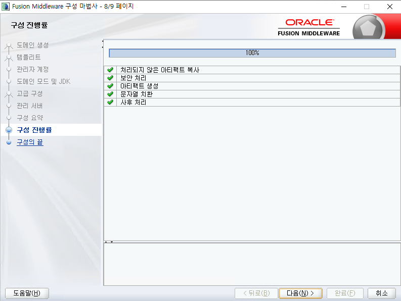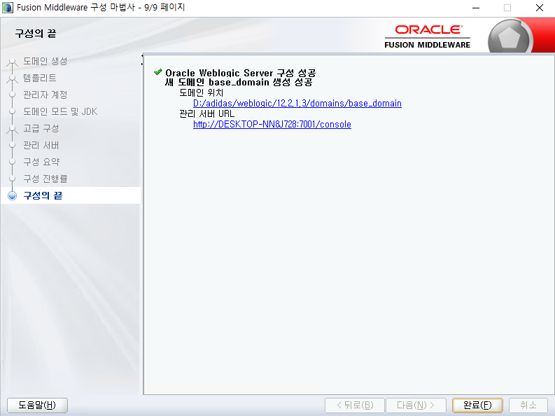 설치 완료 전 구성 마법사 자동 실행이 체크되어 있으면 도메인 구성 마법사가 자동으로 실행