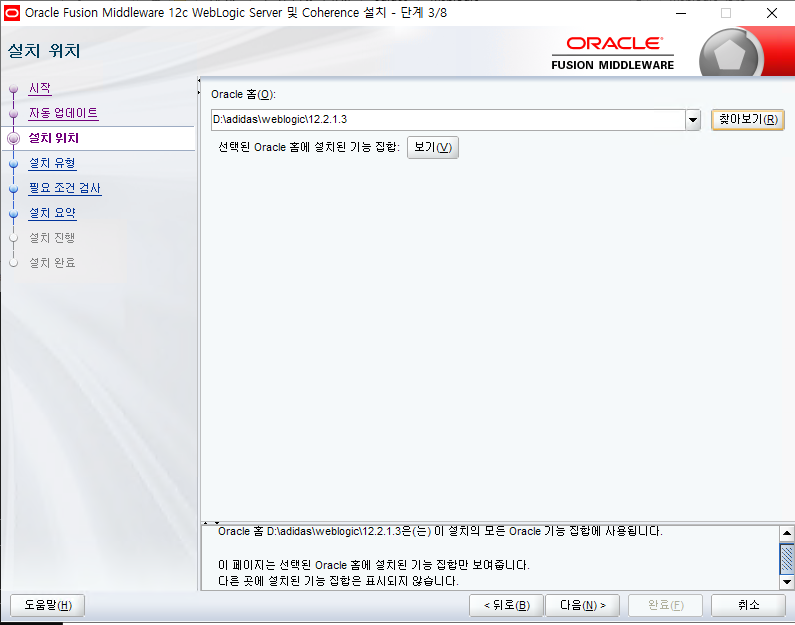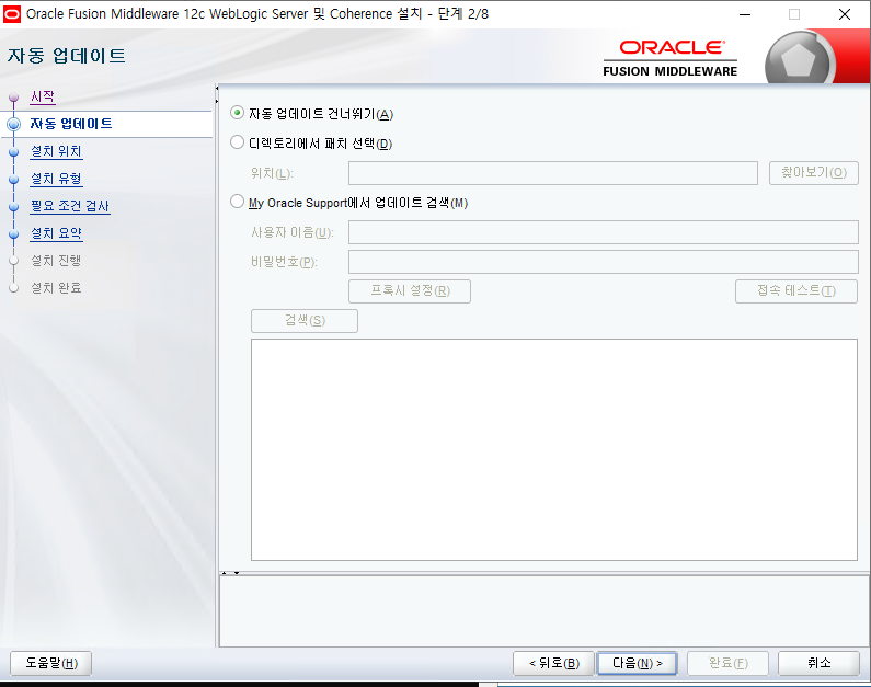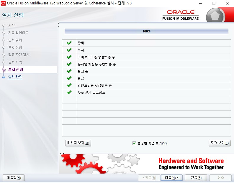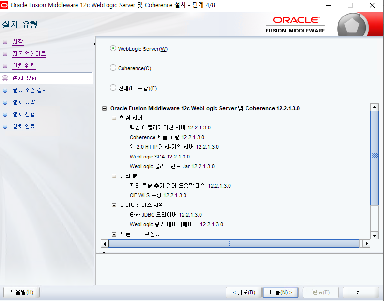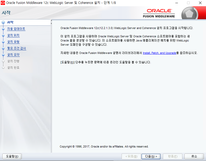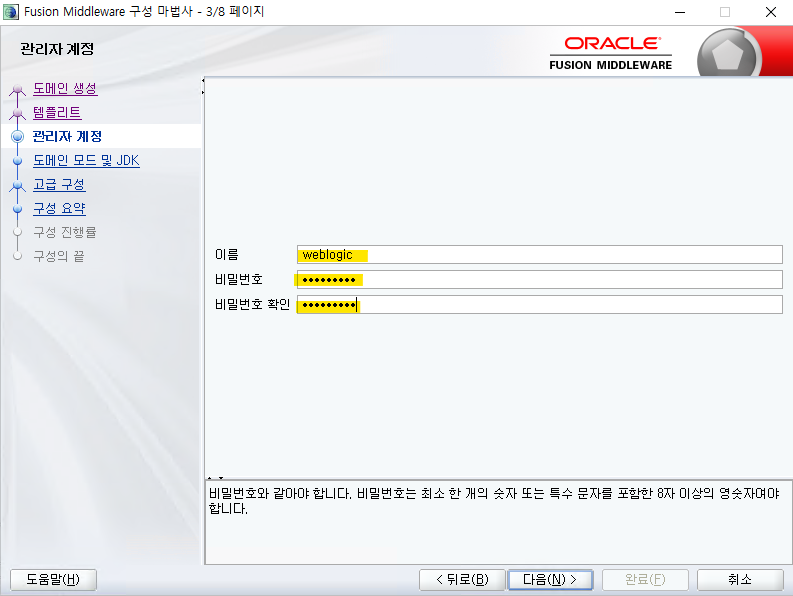 설치 완료 전 구성 마법사 자동 실행이 체크되어 있으면 도메인 구성 마법사가 자동으로 실행