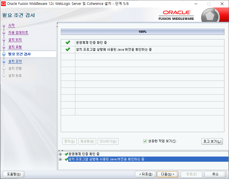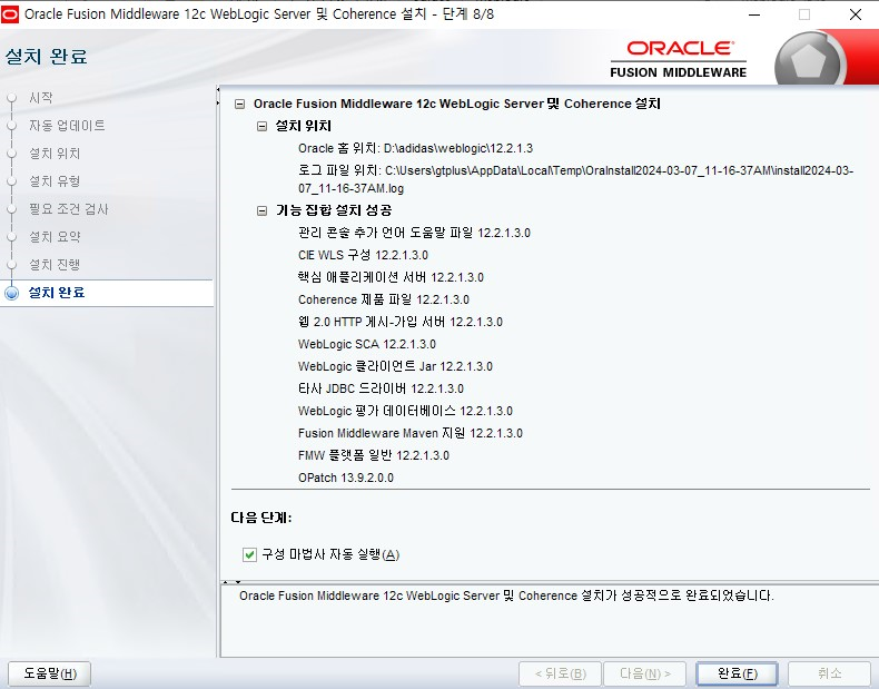 완료 버튼 클릭 전 구성 마법사 자동 실행 체크 확인