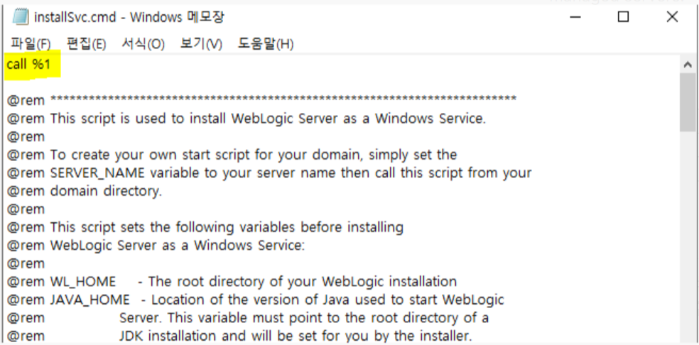 !! 위의 AdminSvc.cmd 파일을 별도로 생성하여 호출하는 방법은 서버 환경변수 및 자바옵션 관련 파일을 별도로 생성하여 관리상의 이점이 있지만 제대로 동작하지 않는 경우도 있음