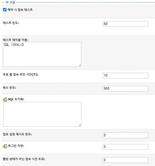 커넥션이 유효하다고 입증되면 설정한 시간(초)만큼은 양호한 상태로 판단하여 연결 테스트를 건너뛰는 옵션