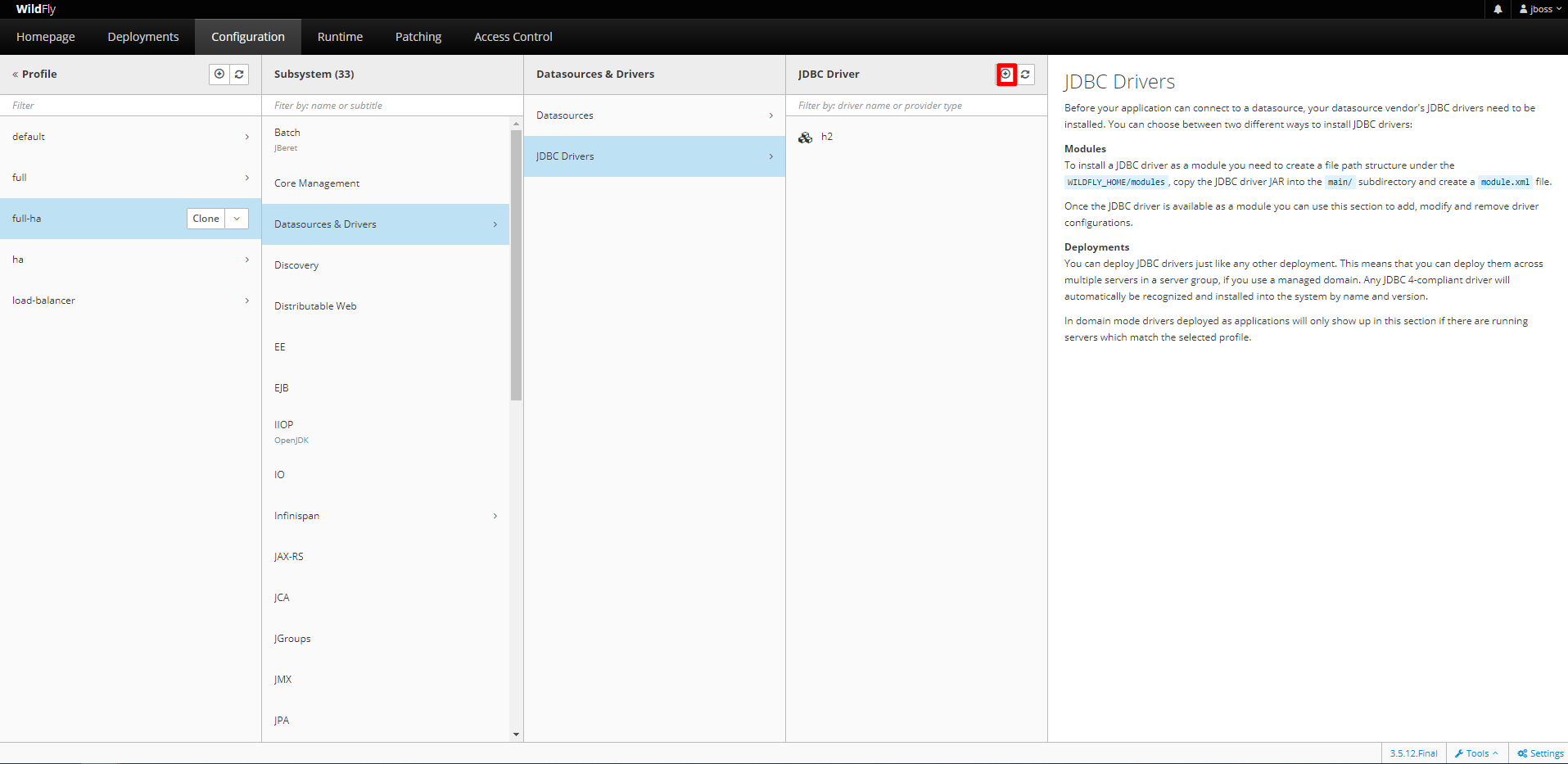스탠드얼론 모드 : configuration - subsystems - Datasources & Drivers - JDBC Drivers - +